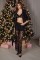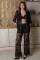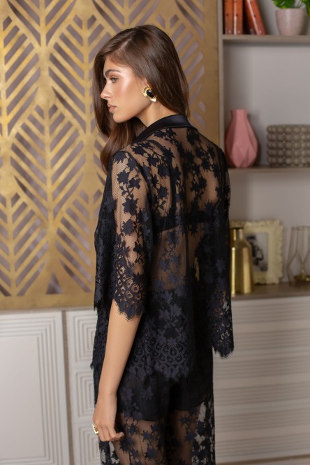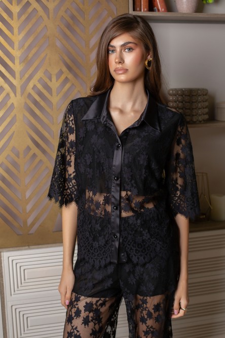 Благородный комплект из полупрозрачного кружевного полотна, состоящий из блузы свободного кроя и длинных брюк.